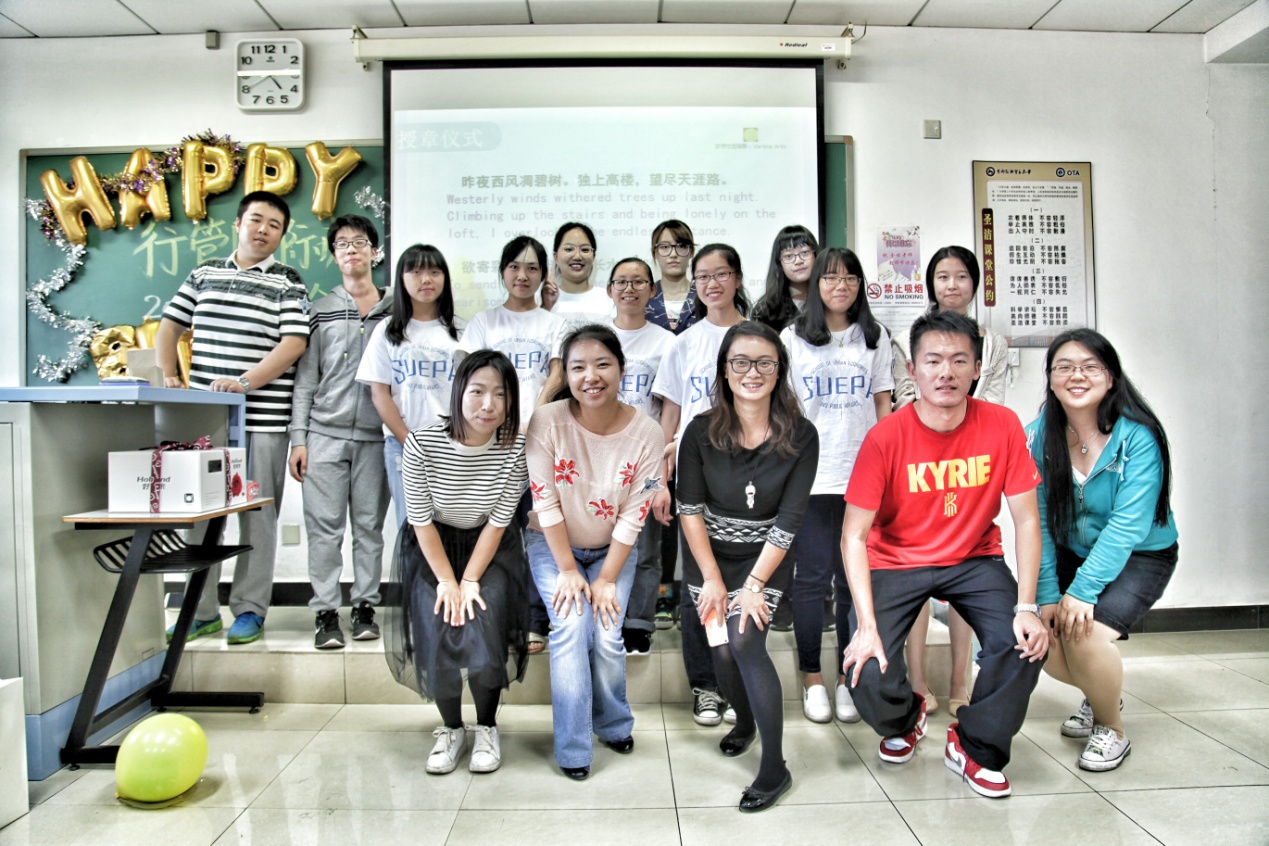 之后,国际班徽章授予仪式将本次仪式推向高潮。仪式采用“代代相传”的形式,高年级的班主任与学长纷纷为低一级班主任学长们授予国际班徽章。小小的徽章凝聚了老师们和学长学姐的关怀与期盼。两个大写的PA代表行政管理的专业,后面的地球代表了国际化的时代,双翼则告诉我们,国际班将助我们从这里开始实现理想,飞向远方。