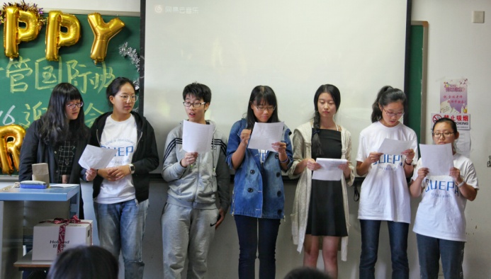 为表达对各位可敬可爱的老师和亲切温暖的学长学姐的感激,新生全体女生带来了一首小合唱,一首振奋人心的Viva la vida赢得了热烈掌声。