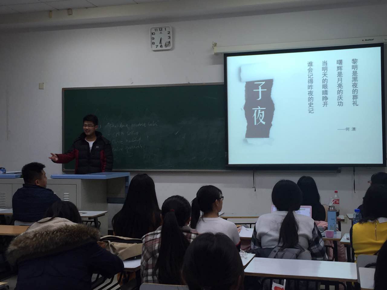 在座的同学们都深深感受到了《子夜》的魅力,提升起了对阅读的无限兴趣。其他班的讲解中不乏分享《了不起的盖茨比》、《苏菲的世界》、《红与黑》、《少年维特之烦恼》、《阿甘正传》以及《七种武器》等这样文学性小说作品的,也有更欣赏《精神明亮的人》一类散文随笔的,也不乏解析《乔布斯传》等名人传记的,更少不了分享《道德情操论》、《全球通史》、《时间简史》、《第三帝国的兴亡》等研究性学术作品的,还有同学则更乐于分享一些如《拖延心理学》、《遇见未知的自己》的更具有实用性、更现代的书籍。“少年维特之烦恼,也许我们都曾有,或许我们都将有。深深地爱着一个永远不可能得到的人而不能自已,这实在是人世间莫大的悲哀,值得我们去同情。”公共管理4班,正在分享《少年维特之烦恼》的文思齐同学如是说。