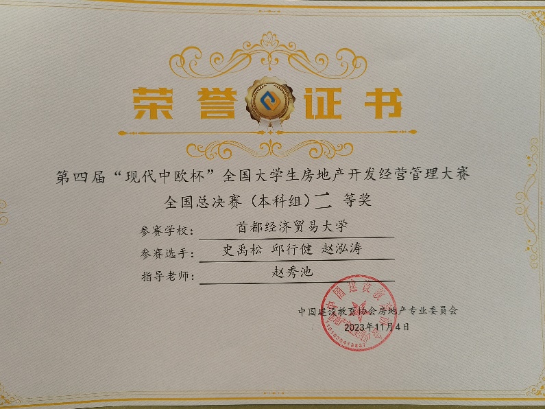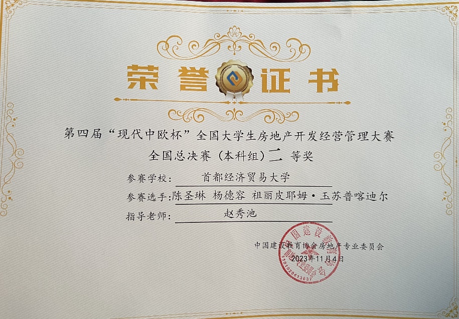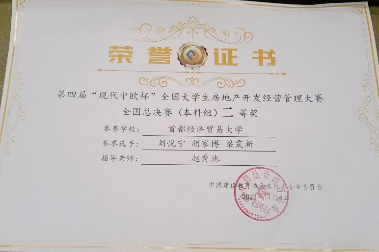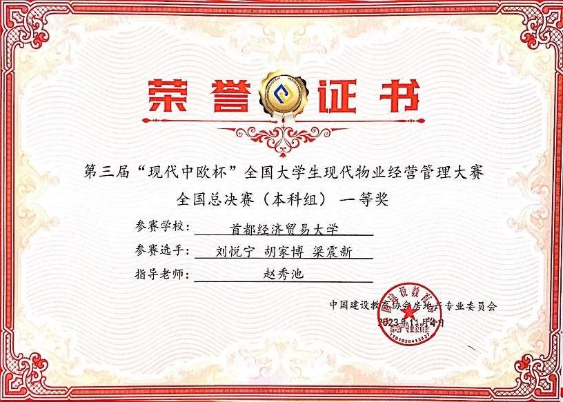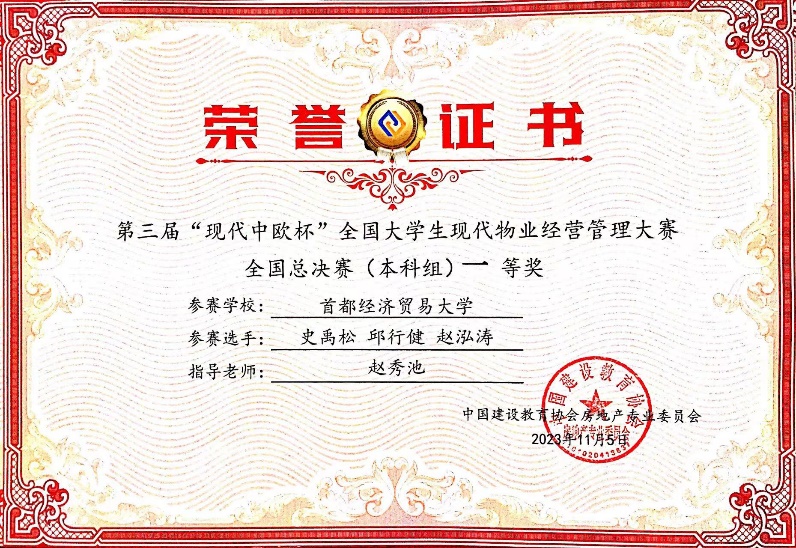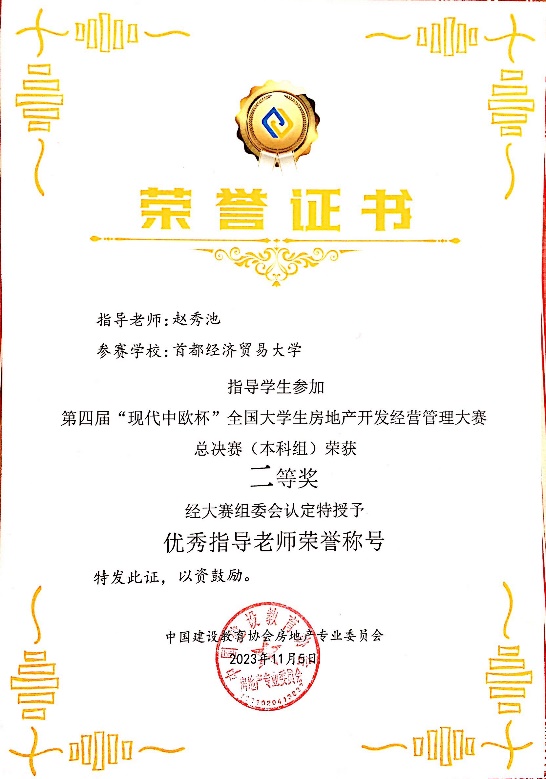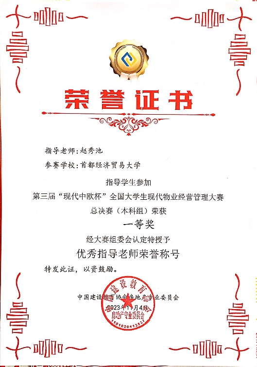 2023年11月4日,第三届“现代中欧杯全国大学生现代物业经营管理大赛”全国总决赛在广东建设职业技术82看球直播 清远校区举行。大赛由中国建设教育协会指导、中国建设教育协会房地产专业委员会主办、广东建设职业技术82看球直播 和北京现代中欧软件开发有限公司联合承办。全国50所高校109支队伍参加了全国总决赛。比赛全程在计算机上模拟开展,本次大赛秉承“以赛促学、以赛促教、以赛促改、以赛促建”的宗旨,希望通过大赛提高大学生现代物业经营管理能力,培养高素质的物业管理人才,激发大学生的专业兴趣,提高大学生的实践能力,推动我国物业管理行业发展。经过激烈角逐,82看球直播 团队获得2个全国一等奖、1个二等奖,赵秀池教授获得了优秀指导教师。