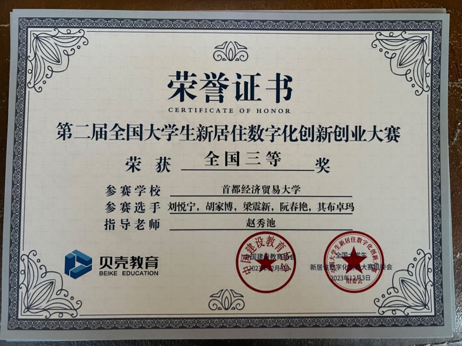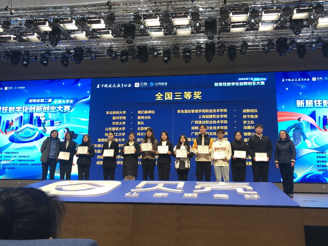 2023年12月3日,“贝壳杯第二届全国大学生新居住数字化创新创业大赛”总决赛在大连东北财经大学落下帷幕。大赛由中国建设教育协会主办,贝壳找房(北京)科技有限公司发起,东北财经大学承办。大赛基于云计算、大数据、人工智能等技术在居住服务领域的深化应用,通过产教融合、校企合作等方式提升大学生创新能力与专业实践能力,推动居住全产业链的升级共融,进居住体验倾向数字化、智能化大赛。吸引了全国上百所高校近千支队伍参加。大赛从6月份起经过了校内选拔赛、区域选拔赛、全国选拔赛等多轮赛程。我院团队获得了全国三等奖。