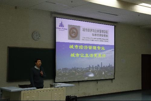 讲座一开始,谭老师就1984年至今的城市经济管理专业的专业史讲解了我国在此方面一系列的教育投入及成果。借此,谭老师说明了我校在此专业的特点,即经济特色和八大优势,从应用经济学基础到学生的总体培养方向分析了我校城市经济管理专业几年来取得的教育成果。