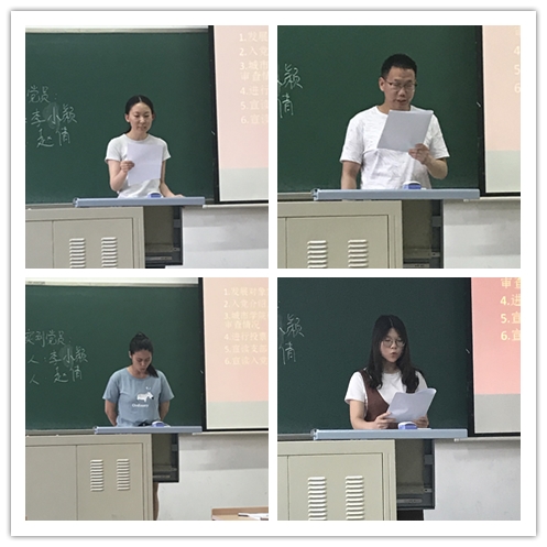 2018年06月19日晚,82看球直播 研究生党支部党员大会于博学楼302成功召开,会议由城市82看球直播 研究生党支部副书记魏思源主持,城市82看球直播 研究生党支部书记杨澜老师、研究生党员、预备党员、入党积极分子出席。 图1宣读入党志愿书 会议主要围绕两大内容开展,第一项内容是接受邹碧莹、董建振、陆园园、王利娟、李帅五位同学为预备党员的讨论,5名发展对象先后上台宣读入党志愿书,培养人对发展对象情况进行介绍发言,并由党支部委员宣读考察报告。由全体党员对发展对象进行投票表决,最终表决全票通过...