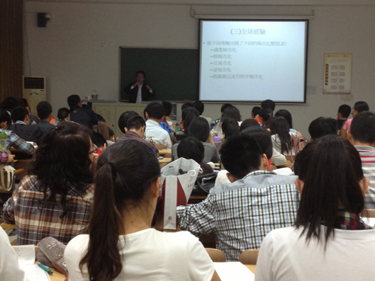 “城镇化”进校园 本硕博学生“漫”讲坛 城市经济管理系 供稿 2013年9月17日,博学楼412近百人的“城市讲坛”教室座无虚席,尽管教室热气腾腾,楼道内仍然有学生进入,教室后墙边开始站着不少学生。负责老师迅速更换更大的教室,以满足120多名来自全校各院系的本科、硕士及博士研究生的求知热情。 讲坛在热烈的掌声中开始。全国人大代表、香港大学地理系原主任、香港浸会大学中国经济研究所原所长薛凤旋教授作了题为“城镇化的国际经验与我国的新型城镇化”的演讲。 薛教授主要讲了八个部分:一、城镇化涵...