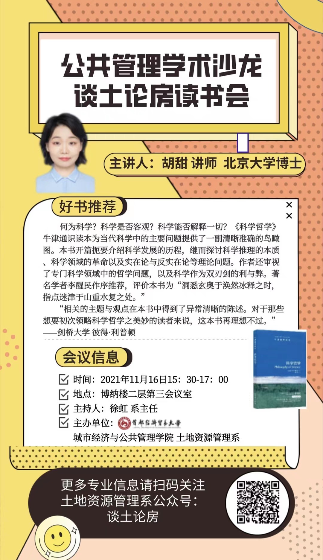2021年11月16日下午,土地资源管理系“谈土论房”读书交流分享活动在博纳楼第三会议室举行。活动由土地资源管理系主任徐虹老师主持,由胡甜老师向同学们分享了好书——《科学哲学》牛津通识读本,全系青年教师、研究生与部分本科生共同参与。 胡甜老师从何为科学,科学是否客观,科学能否解释一切等一系列问题入手,结合自身经历,分享了科学推理的本质、科学解释、常规科学与范式变迁等内容,鼓励大家在做学问过程中要有好奇心,有质疑的精神。本次活动还通过现场抽红包的趣味形式向部分同学赠送了《科学哲学》书籍。...